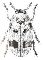 Una sola especie en la P. Ibérica. Se distingue por su pronoto rojizo, generalmente con manchas negras, y por el perfil lateral de los élitros, más elevado en la región postescutelar que en las áreas vecinas. Cabeza negra y pequeña, de mandíbulas poco aparentes y epistoma sinuado; las antenas son cortas, de color anaranjado, no superan la mitad del pronoto y están dentadas a partir del 5º antenómero; ojos grandes y ovoides pero poco salientes; frente y vértice cefálicos cubiertos por una pilosidad densa de color blanco…… (sigue en F. Ibérica V.13)