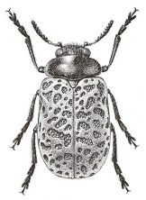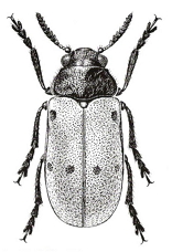 Borde anterior de los élitros con margen aquillado, estos últimos de color amarillo con 3 manchas negras, 1 humeral y 2 postmedianas.