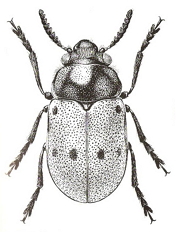 Borde anterior de los élitros sin margen aquillado, estos últimos de color rojizo y cubiertos por grandes fosetas de fondo negro violáceo.