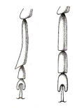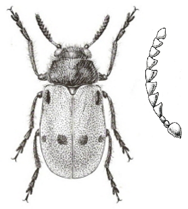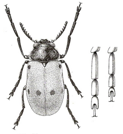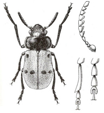 Antenas aserradas a partir del 5º artejo, el 4º de forma triangular (fig.). El 1º tarsómero de las patas anteriores es en los machos de longitud mayor a la de los 2 siguientes reunidos y mucho más corto en las hembras, el 3º cordiforme (fig.). Élitros de color generalmente rojizo.