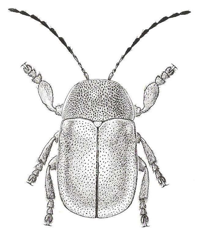 texto Cuerpo glabro, de color testáceo o pardo, patas cortas, tibias muy robustas y comprimidas y tarsos subcuadrados, tan anchos como largos (ver figura). Cabeza con puntuación fina y densa, de color variable, amarillo testáceo o pardo; el vértice, las genas y las áreas perioculares internas son de color más claro que el resto; los ojos son alargados y ligeramente sinuados y las mandíbulas pequeñas; las antenas presentan una longitud similar a la mitad del cuerpo, los cuatro primeros antenómeros son amarillos y los restantes pardos o negros. Pronoto transverso y lúcido, muy convexo y estrechado anteriormente, de color pardorrojizo más o menos oscuro, cubierto por una puntuación muy fina y densa; los……………….(continua: ver F. Ibérica V.13)
