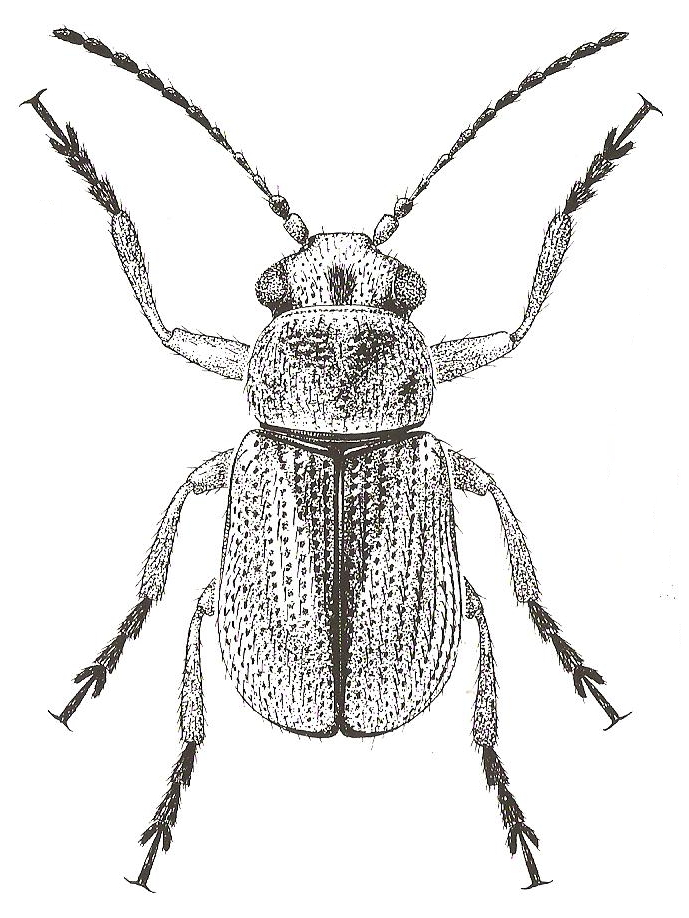Cuerpo subcilíndrico alargado de color amarillo testáceo, los élitros regularmente punteados y los tarsos muy largos. Cabeza pubescente, densa y con fuerte puntuación; las mandíbulas, los palpos, una línea frontal y el vértice son de color negro, mientras el resto es amarillo testáceo; las antenas son cortas y los antenómeros que van del 3º al 5º son los de mayor longitud…………………..(continua: F. Ibérica V.13)